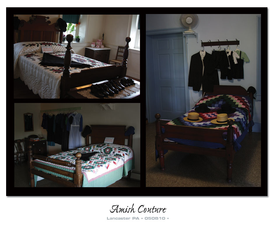 Their attire are simple, and in solid, muted colors without adornment (buttons and zippers included) to call attention to the wearer. A clothing is either sewed shut, or hook and eyes are used for clasp in men and straight pins as fasteners for women. (That’s one VERY pokey dress to wear!) The women’s attire consist of a cotton dress in solid colors (black, white, dark blue or aubergine) pinned over with an apron on the waist and a bib over the chest depending on the event/occasion and completed with a cap on the head. The men have their white shirt, pants without belts but held up by suspenders-like trimmings, black vest, a coat and topped of with a hat; straw hats for summer and black felt hats for winter. (Even their pants have no zippers or buttons! I checked.) In the winter, the men have a heavy long coat to cover themselves with, while the women only have a light shawl to drape over their shoulders. Shoes are black laced-up Oxfords, even for the toddlers! However, during the warmer months, many children go barefoot even to school.