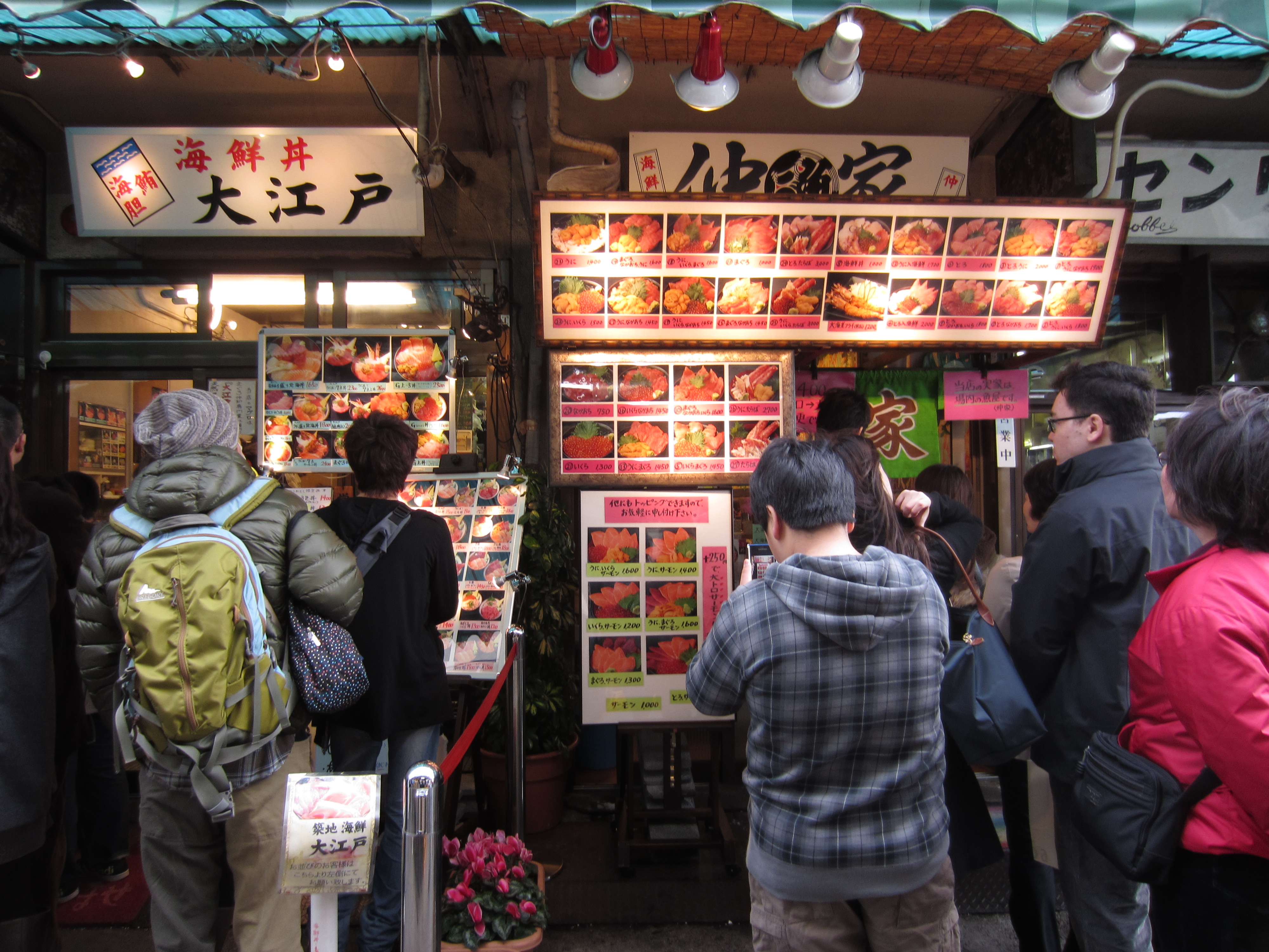 We walked from Tsukiji (two subway stops) into Ginza, an upscale area of Tokyo with a number of department stores. Since it was still early (9-ish), none of the stores were opened but there was a surprising line outside two stores (which I later found out to be g.u. and Uniqlo). There were lines because not only was it their grand opening, they were also offering 10% off their products. I guess these people haven’t seen Black Friday sales yet. You won’t catch me up lining up for a miserly 10% on a Saturday morning.