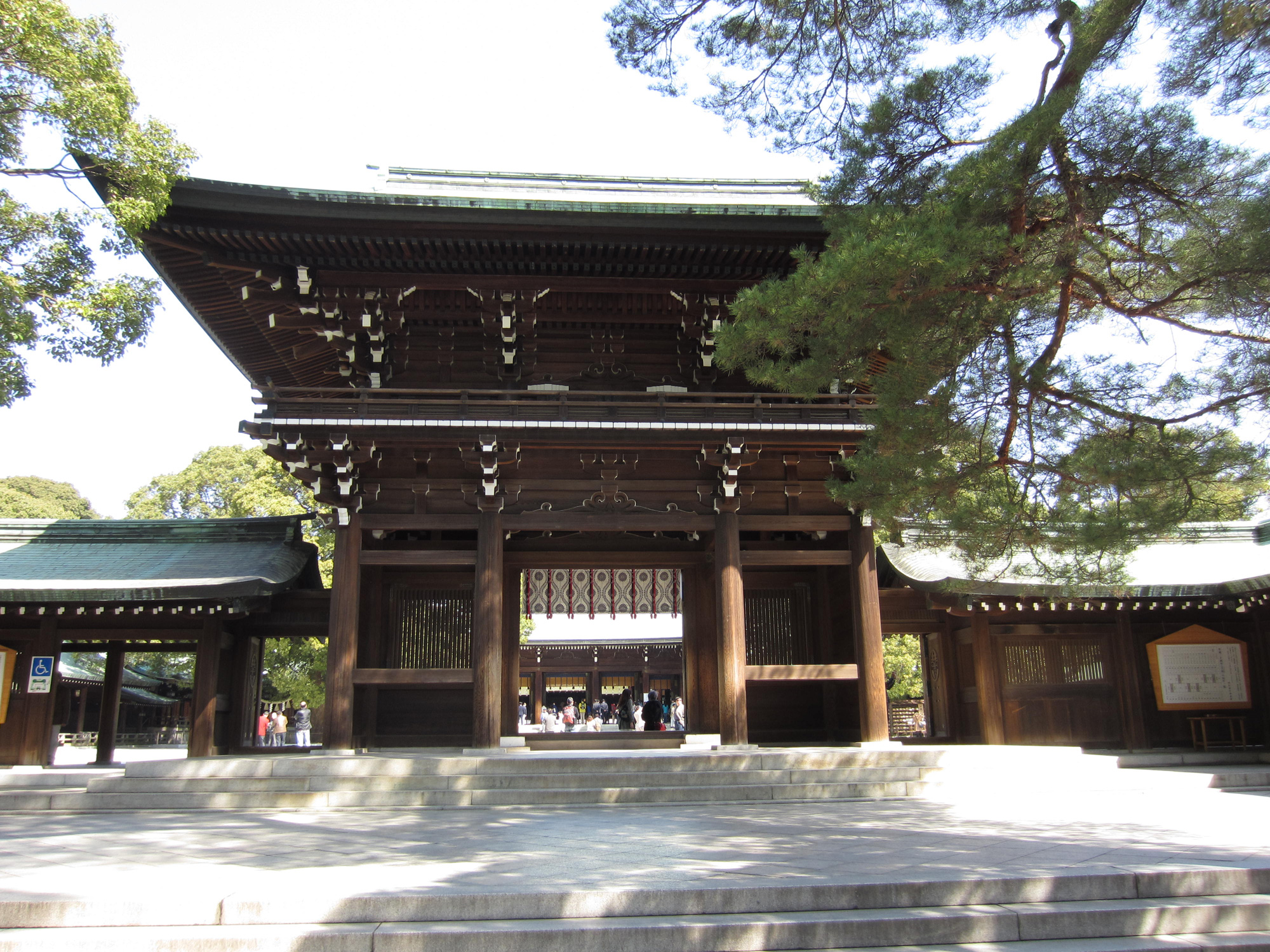 The Meiji Jingu (Meiji Shrine) 明治神宮 is a Shinto (Japan’s original religion) Shrine dedicated to the Emperor Meiji (1867-1912) and his empress, Empress Shoken (1849-1914) (both their tombs are in Kyoto). The Empress was later granted the title Empress Dowager (皇太后 Kōtaigō) when the emperor died in 1912. After his death, a resolution was passed to commemorate their virtues and his role in the Meiji Restoration. An iris garden in Tokyo, frequented by the royal couple, were then chosen. Construction began in 1915, completed in 1921, destroyed during the air raids of WWII, and then reconstructed in 1958.