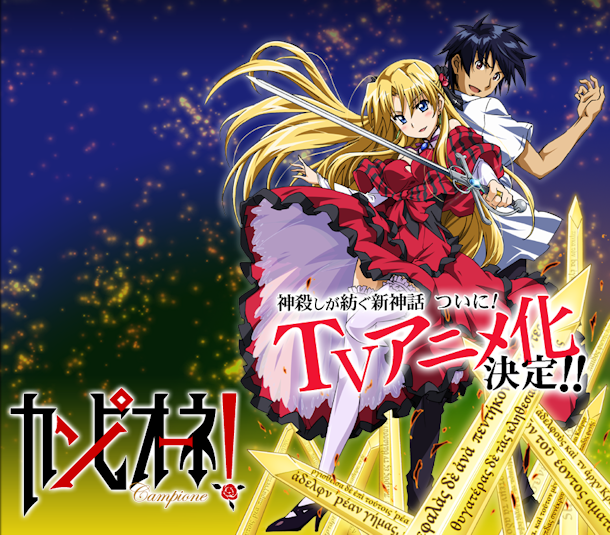 Campione!Campione! (カンピオーネ! Kanpione!) is a light novel series by Jō Taketsuki, which was adapted into manga in 2011 and later into anime series in July 6, 2012 with a planned 12 episodes.