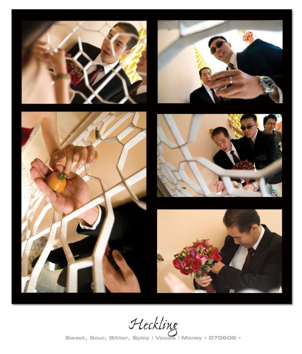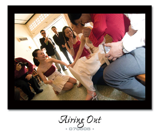 First, there was the ultra bitter herbal medicine, which the best man chugged down gallantly. Then it was the dynamite of a habeñero pepper that was to be eaten raw. After that, my sisters made up a sickeningly sweet concoction of Pepsi with added sugar. Ahh…not quite enough yet. Of course, my sisters asked for a “password.” In this case, hubs was even prepped for this. But he forgot! My younger sister’s other half, who was part of the groom’s entourage and knew of this password, had to prompt him. Even then, he still managed to screw it up. This was taken straight out of the “Romancing the Star” movie we watched and giggle to when we were young. Then they made the boys sing for me. Unfortunately, none of them knew how to sing. Only my sisters realized I was watching the show the entire time through the peep holes by our stairs. Cheh finally signaled to me, asking me if I would let them in. Fine. No fun at all. After they paid their dues, physically and monetarily (where hubs gave “door opening money” – hoi mun lai si), my father finally opened the grills.