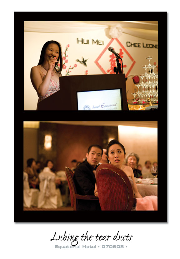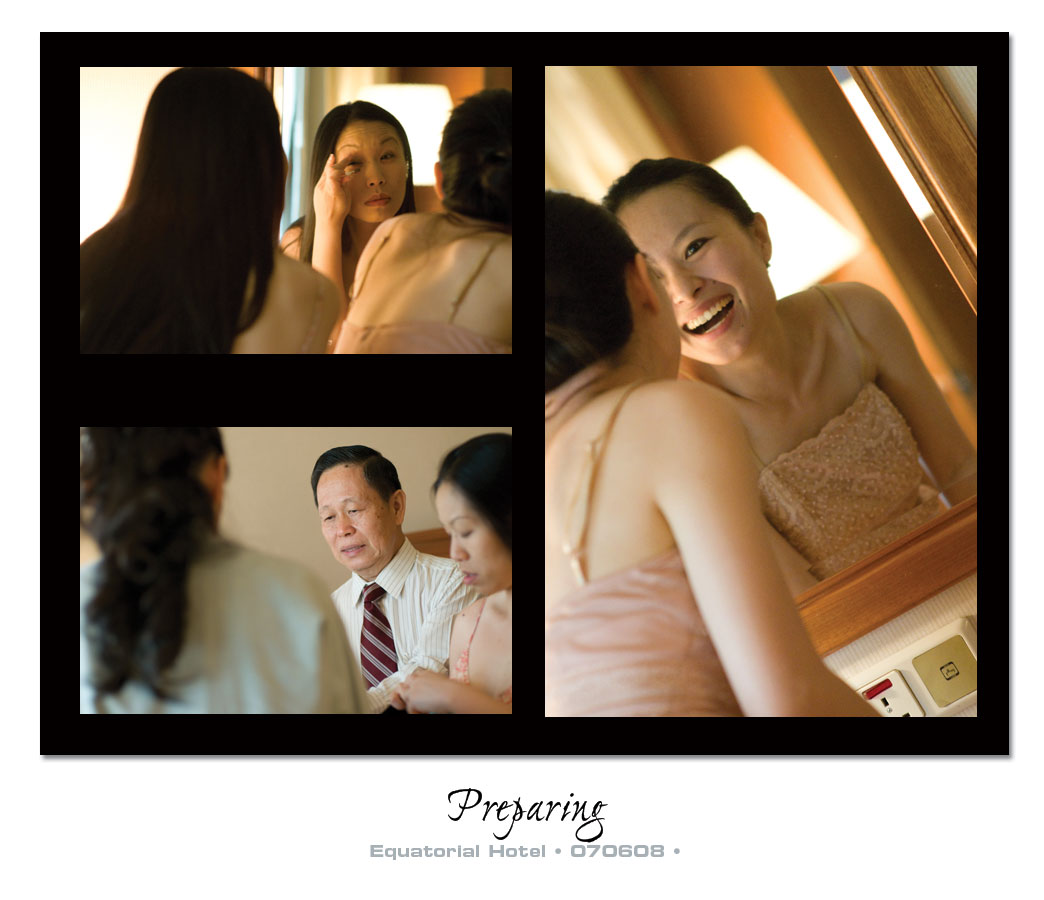 My cousins, who I grew up with since young, all came up to my room to say “hi” as the preparations went on. Finally Cindy was done with me. I haven’t even put on my gown yet, but I were sweating bullets already, not from nervousness, but from the humidity and heat of KL. By the time I had on my corset, and gown, I thought I could faint. I shouldn’t complain, considering hubs had to put on a shirt, tie and a tuxedo. Who was I to bemoan my predicament?! Waist down, flooded. Waist up, was airing out a little.