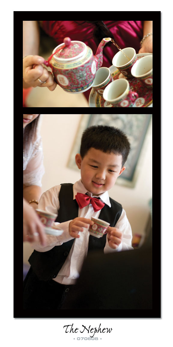 I couldn’t sleep a wink the night before (and before that), it didn’t help that the opposite neighbors were making a ruckus right into the wee hours of the morning. When mommy finally woke up around 4/5 am to prepare the tea for the ceremony later in the day, I too took the opportunity to stop pretending to sleep. Of course, the first thing I did was stuff my face. My younger sister too was surprisingly awake then too. She crept downstairs, careful not to wake her sleeping other half. She then proceeded to stuff her face along side me, and as I read Chinese gossip magazines (not that I really know how to read, I was just looking at pictures) she began writing her speech for the night. Talk about 11th hour. I then decided to de-puff my sagging eye bags with tea bags, and before I knew it, the first relatives began arriving. Unc. Tak and family came bearing cherries imported Canada for mommy. Then Jee Mai came with her family.
