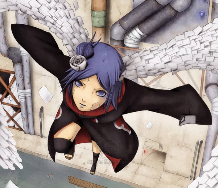 After the destruction and subsequent revival of all the Konoha ninjas, Konan returns to Amegakura with Nagato’s and Yahiko’s bodies, but not before promising Naruto her help in achieving peace. Unfortunately for her, her peace doesn’t last long as Madara infiltrates into Amegakure in search of Nagato’s Rinnegan. When she refuses to divulge the location of his body, a fight ensues. She denotes a lake filled with billions of explosives, lasting longer than the 5 minutes Madara can remain intangible. He, however, remains unharmed, as a result of using Izanagi (like Danzou) but costs him his left eye. He then stabs Konan with a pipe, and places her under his genjutsu to reveal Nagato’s location. She supposedly ceases to exist after the end of the illusion, as her body floats in the waters of Amegakure.