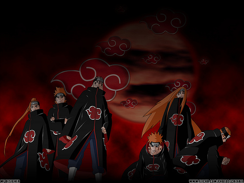 Akatsuki 暁 – Dawn – is a criminal organization made up of S-Class rouge ninjas who have defected from their villages, except for Pain and Konan who were from and run their own village, Amekagure. Even though the major players of the organizations have differing goals, the group’s goal is to collect all the bijuu, tailed beasts, to enable them to dominate the world.