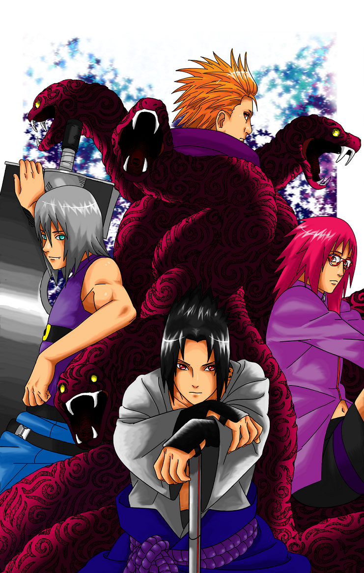 Team Taka, lead by Uchiha Sasuke chose to align themselves with Akatsuki. However, it doesn’t mean that they believe in their philosophies or goals. According to Sasuke, who was trying to convince his teammates on joining the organization, his goal is to restore the Uchiha’s name (and probably Itachi’s), even if it means going against Akatsuki. Taka, however, shares one similar desire – to witness the destruction of Konoha. The team is only an affiliation since they do not possess the rings of the actual members. However, they are assigned the duty of capturing hachibi’s jinchuuriki Killer Bee, while Pain went on the hunt for kyuubi aka Naruto. The team consists of Suigetsu, Juugo and Karin.