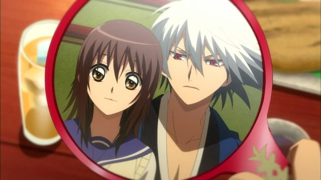 Rikou, upon hearing his friends’ search, sends Sahbagarasu and Aotoba out for their protection. Rikou and Yuki-ona catches up to them, and end up at a shrine that Yura is also investigating. She hides, before they realize her presence, as the group splits up to search for clues of demon activity. Rikou picks up a piece of cloth from a girl’s kimono and shows it to Yuki-ona. Yura, seeing this, thinks that they are trading saliva. She jumps out of the bushes, and surprises them. Rikou and Yuki-ona become nervous, unsure of what she heard transpiring between them about the demon clan. Yura, on the other hand, takes the nervousness as a sign of their guilt and Rikou’s betrayal to Kana. She warns him before she leaves, “If you chase two rabbits, you will loose both. Do not take rabbits too lightly.”