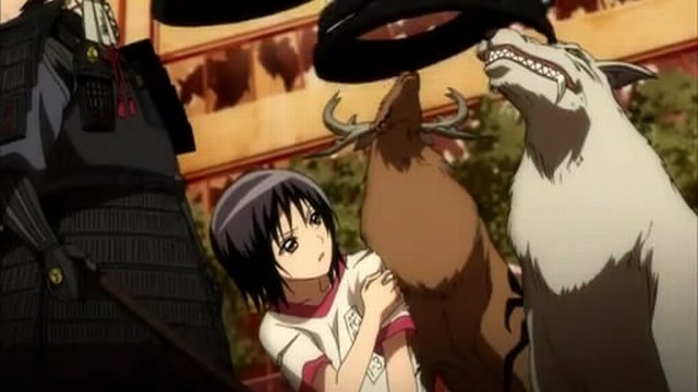 In the mean time, Yura protects the girls with her Shinigami Rentei. The escaping girls catches a glimpse of the fleeing beast as Night Rikou gives chase.