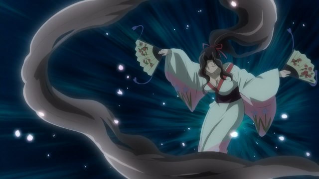 Yura, sensing the demonic aura, gets to a park as Kagibari-ona begins to attack her. But Karasu-Tengu sees this and goes in search of his master. Kagibari-ona questions Yura’s alliance with a demon clan even though she is an onmyouji. Confused, Yura releases her shikigami, but Kagibari-ona takes it down easily. As she is about to finish off a fallen Yura, Kejoro swoops in for the save. Both the women are equally matched, until Night Rikou appears with Kurasu-Tengu. As he attacks Kagibari-ona, she bows in fear of his aura. With her locks shredded, he sends her back to Tamazuki with a message.