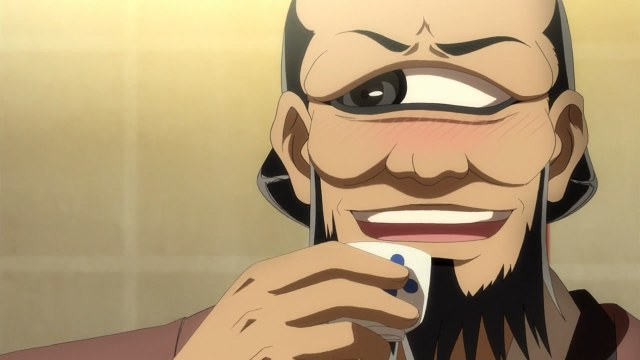 That night, Night Rikou appears. It is time for them to act. He goes with his trusted men to Bakeneko’s restaurant and immediately realizes that their enemy has set up a warning system at the entrance. Kagibari-ona, serving and extrating information from Hitotsume, realizes that someone fearful has entered her domain and immediately takes leave. So, it was the loud mouth Hitotsume who was the informant. As the rest of the council members corner Hitotsume for spilling the beans on the family, but he expertly shifts the blame once again to Rikou.