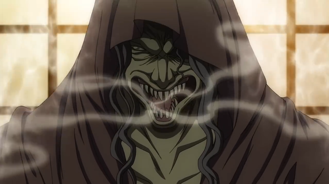 Together with Tsurara, Rikou takes off on of Tsuchigumo’s arms. But is quickly subdued when the ogre finally shows his true powers. With the strength of all in sync, they manage to cut Tsuchigumo in half. The undead remains strong as he patches his cut half back together. While doing so, he tells them about Nue, Abe no Seimei, a powerful onmyouji. He will sleep until the Nue is born.