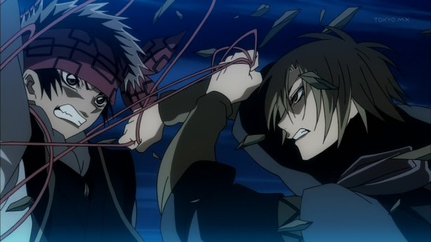 Itaku’s sickles are temporarily incapacitated by Kubinashi’s web of strings. As the fight progresses, Kejorou begs Kubinashi to end the mindless competition. It falls on deaf ears. Soon Itaku releases his true form and cuts off his bindings. Rikou tries to stop them, but Zen steps in in his stead.