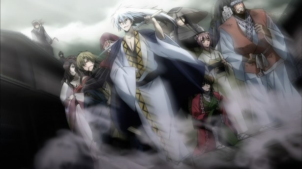 Past leaders surround her, temporarily shocking Hagoromo Gitsune. Yura quickly commons them to attack, but they are don’t follow. She panics. At this juncture, a calm voice speaks out to her: Hidemoto, the fabled 13th heir. Before Hagoromo Gitsune finds an opening towards Ryuuji and the rescuing Mamiru, Hidemoto imparts a technique to her. A thick plume of smoke cover the remaining Keikain Clan, allowing them to free Akifusa from the possession of Minagoroshi-Jizou and give him the antidote. Yura calls for an immediate retreat.