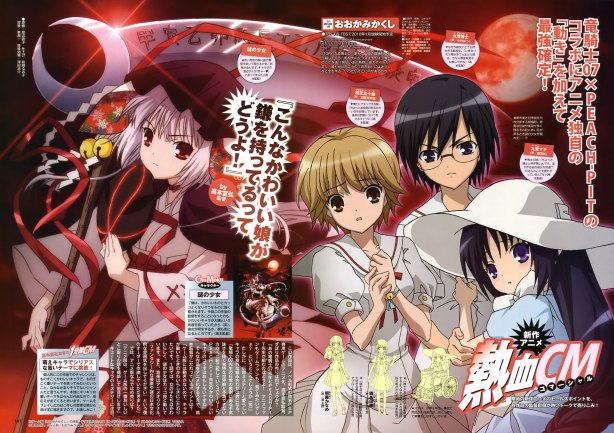 Ookami Kakushi (spirited away by wolves) is a novel developed by Konami for Playstation Portable released on August 20, 2009 in Japan. It was later adapted to anime by AIC and aired on January 8, 2010 on TBS. To promote the anime, an Internet radio show called “JTTB Jouga-machi Kankou Kyoukai” began broadcasting weekly on Fridays beginning December 18, 2009. Mirura Yano later adapted this series to manga, entitling it Ookami Kakushi: Fukahi no Shou (おおかみかくし〜深緋の章〜) in February 2010.