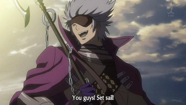 Soon, Toyotomi’s men arrive and Mori’s is withdrawn. Chousokabe’s parrot warns him that something more ominous is approaching. Hideyoshi the giant appears! He walks into the sea and asks them for their allegiance or there will be slaughtered like the bandits that they are. Chousokabe laughs at his request. In retaliation, Hideyoshi hits the sea and parts in, leaving only land behind. So, he had no need for a fleet, as the Toyotomi army inches forward towards Chousokabe’s armada. Chousokabe fires his cannon. The unflinching Hideyoshi dispels it with one hand. The army quickly surrounds the armada. But the ship surprises the enemy when it begins to move on land! Hideyoshi attacks Chousokabe. His country doesn’t need a pirate like him.